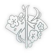 Her revue outfit comprises of a red-violet jacket with golden piping, a standing-type collar with a golden tassel at the joint, pale-yellow turnbacks with golden piping and detailing, pale-yellow cuff flaps with a golden trim, and a golden armband, aiguillettes, and epaulettes over a plain-white button-up shirt with a ruffle collar. Her belt is golden with a golden buckle identical to Futaba's. Her skirt is a very-pale-pink knife-pleated skirt with a purple-pink band near the bottom, a purple-pink ribbon at the back, and a light-blue tulle dress tail. Like all the other girls, she wears black boots with golden trim detailing and a tassel, as well as a red pelisse jacket with golden piping over her left shoulder, held to a red shoulder belt by a golden aiguillette and a golden button. Her weapon is a naginata with an amethyst-colored gem between its collar and spacer.